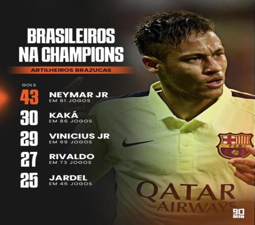 场均进球:贾德尔≈内马尔 > 维尼修斯 > 里瓦尔多 > 卡卡