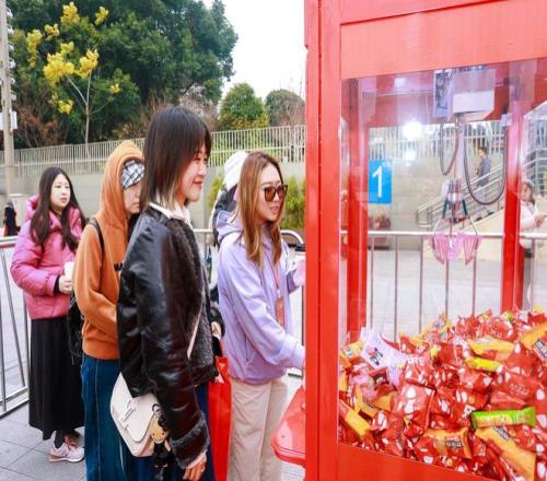 1月17日,新年糖花车巡游上海站路演于北外滩国客中心沿江广场开启。一旁有新年糖罐套圈游戏区,整点时分人群则汇聚于盛大的"外滩糖果雨"。巨型真人新年糖抓娃娃机前始终人头攒动。